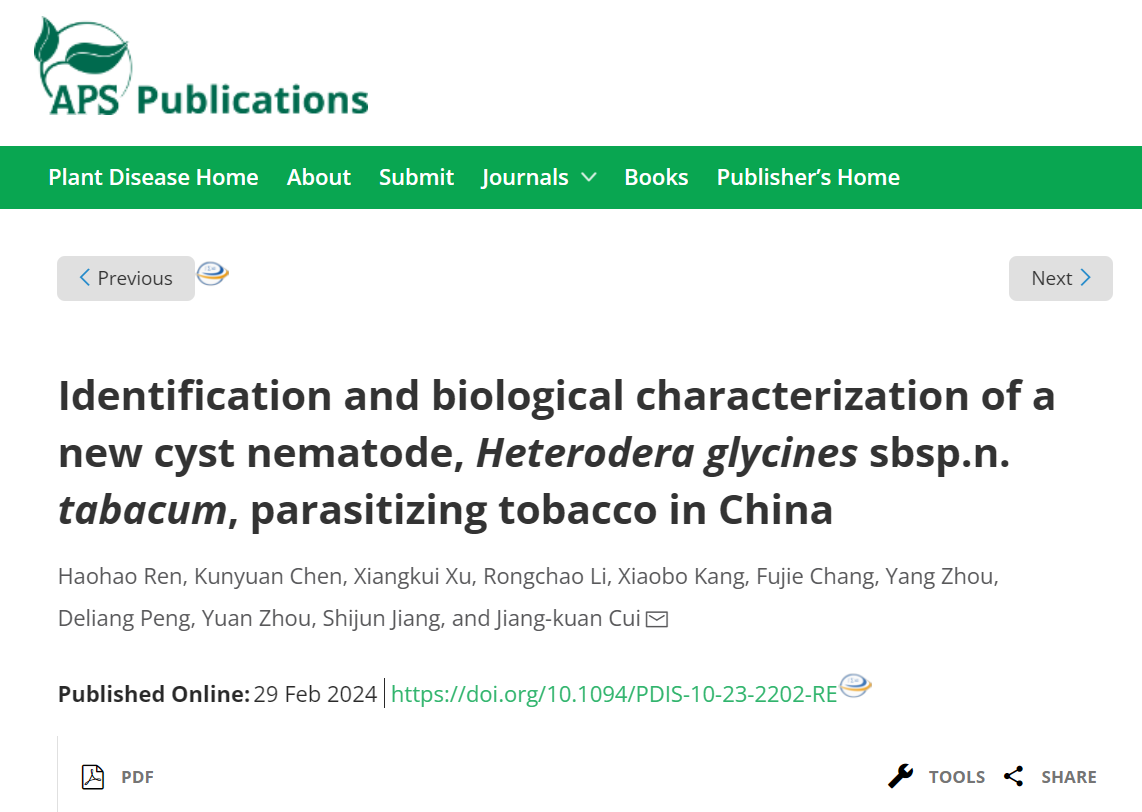 本网讯(通讯员 任豪豪 崔江宽)近日,成人动漫蒋士君教授/崔江宽副教授团队在《Plant Disease》上发表题为“Identification and biological characterization of a new cyst nematode, Heterodera glycines sbsp.n. tabacum, parasitizing tobacco in China”的研究论文。论文新发现了一种严重危害烟草生产的作物孢囊线虫新种。全文链接