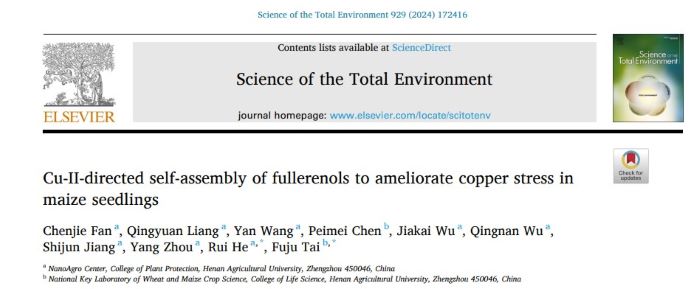 一区,IF:9.8)正式发表题为“Cu-II-directed self-assembly of fullerenols to ameliorate copper stress in maize seedlings”的研究论文(2024, 929:172416)。该研究解析了Cu2+诱导水溶性零维碳纳米酶(富勒醇)自组装体缓解铜胁迫下玉米种子萌发和幼苗生长的解毒诱抗机制。
