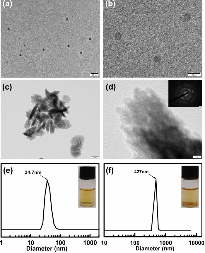 图1 水溶性纳米复合物Cu2+@Fol (a,b,e)和水不溶纳米杂化物Cu2+@Fol-2 (c,d,f)的TEM图、DLS图