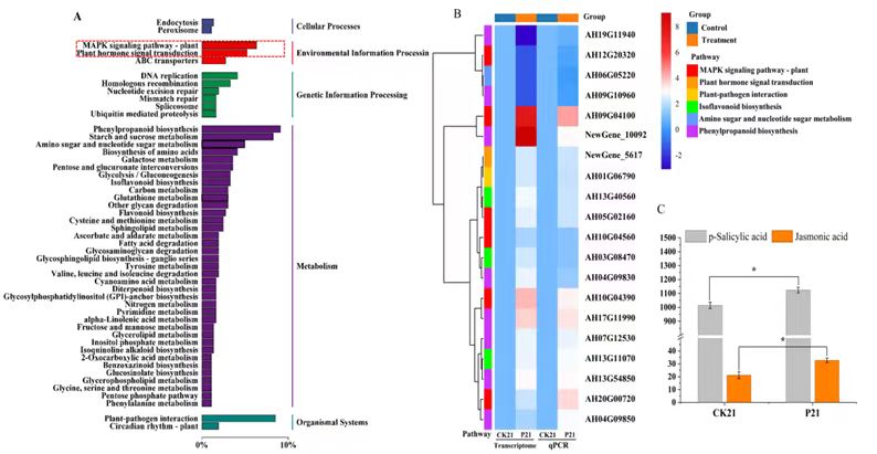 Figure 7 Transcriptomic and metabolomic analyses of peanut roots in response to S. rolfsii infection after PHY seed treatment. (A) KEGG enrichment analysis of differentially expressed genes between CK21 and P21. (B) Heatmap showing the expression patterns of 20 selected DEGs from RNA-seq and qRT-PCR data. (C) Contents of salicylic acid and jasmonic acid in peanut roots quantified by UPLC-MS/MS.