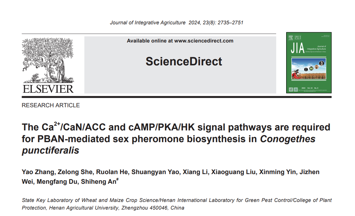 一区TOP期刊《 Journal of Integrative Agriculture》杂志在线发表了题为“The CaN/ACC and cAMP/PKA/HK signal pathways are required for PBAN-mediated sex pheromone biosynthesis in Conogethes punctiferalis”的研究论文。研究揭示了PBAN调控桃蛀螟性信息素生物合成的信号转导机制。