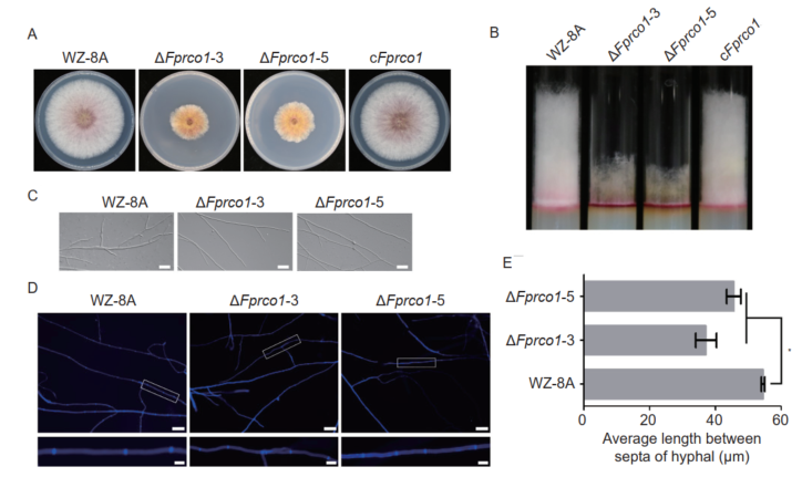 为了探索假禾谷镰孢致病的分子机制,研究团队通过正向遗传学的方法,以假禾谷镰孢强致病力菌株WZ-8A为背景,构建了T-DNA插入突变体文库,获得了的突变体约500个。利用该方法快速鉴定到了在假禾谷镰孢侵染过程中发挥关键作用的基因,先前该团队已经报道的在假禾谷镰孢菌丝融合中发挥关键作用的基因FpHam也是通过该方法鉴定的(Chen et al., 2023)。本研究进一步通过验证T-DNA插入突变体在大麦上的致病力,筛选到了9个致病力显著降低的突变体。经鉴定,其中一个突变体的FpRCO1基因被破坏,该基因是酿酒酵母RCO1的同源基因,编码的产物是Rpd3S组蛋白去乙酰化酶复合物的重要组成部分。为了进一步验证插入突变体表型的变化是由FpRCO1基因的被破坏导致的,该团队通过split-marker的方法敲除了该基因进一步分析其表型。