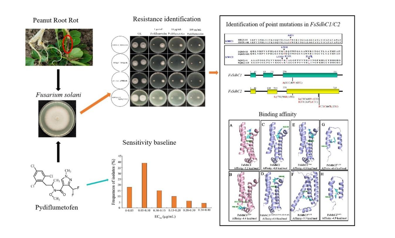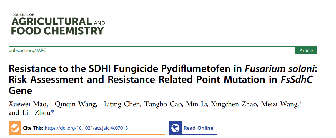 近日,成人动漫周琳教授课题组又在中国科成人动漫 一区TOP期刊《Journal of Agricultural and Food Chemistry》杂志上发表了题为“Resistance to the SDHI Fungicide Pydiflumetofen in Fusarium solani: Risk Assessment and Resistance-related Point Mutation in FsSdhC gene”的研究论文。该研究评估了SDHI类杀菌剂氟唑菌酰羟胺对茄腐镰刀菌的抗性风险,明确了FsSdhC2亚基点突变是引起花生根腐病菌产生抗性的主要原因,为氟唑菌酰羟胺科学应用于花生根腐病防控提供了重要支撑。
