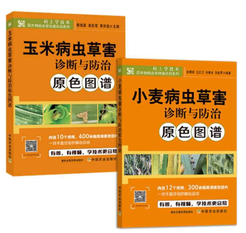 《玉米病虫草害诊断与防治原色图谱》共分玉米病害、玉米害虫及其天敌昆虫及玉米田常见杂草三部分,全书图文并茂,真实记录了玉米常见病虫草的形态和为害症状,在选用照片时力求做到全面反映病虫草害不同发育阶段的识别特点,直观实用,便于识别,易学易记。《小麦病虫草害诊断与防治原色图谱》形象直观、易学易记、实用性强,全书分为四部分,分别从小麦病害、麦田害虫、麦田天敌昆虫和麦田杂草四个方面形象生动的介绍了小麦常见病虫草害的形态和为害症状。专家们整理大量小麦病害症状、害虫为害状、害虫及天敌形态、麦田杂草等高质量的原色生态照片,总结了小麦病虫草害综合防控方面多年的实践经验,提高了小麦病虫草害的识别和防控水平。