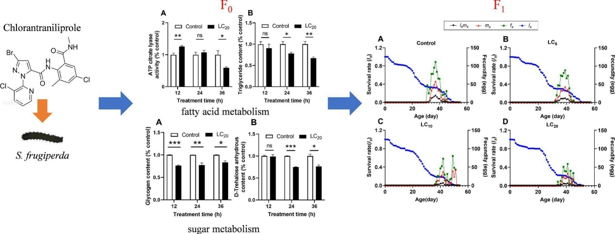 本研究系统探讨了氯虫苯甲酰胺对草地贪夜蛾的亚致死效应及其跨代影响。结果表明,草地贪夜蛾幼虫持续暴露于亚致死浓度氯虫苯甲酰胺不仅延长了幼虫和蛹期发育历期,还显著降低了各发育阶段的体重,降低了化蛹率,并显著损害了卵巢发育。此外,暴露于亚致死浓度的氯虫苯甲酰胺显著提高了近似消化率(AD),但降低了消化食物的转化效率(ECD)、摄入食物的转化效率(ECI)和相对生长率(RGR),导致F0代出现了生长、发育和代谢解毒所需的营养缺乏,并大幅耗竭了储存的能量。重要的是,研究发现处理过的昆虫中能量储存化合物(糖原、海藻糖和甘油三酯)显著减少,伴随糖脂代谢相关酶和基因的变化。此外,年龄阶段两性生命表分析显示了显著的跨代影响,阻碍了F1代的种群增长。