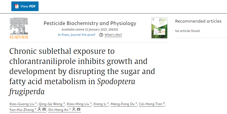 一区TOP期刊《Pesticide Biochemistry and Physiology》杂志在线发表了题为“Chronic sublethal exposure to chlorantraniliprole inhibits growth and development by disrupting the sugar and fatty acid metabolism in Spodoptera frugiperda”的研究论文。研究发现,草地贪夜蛾暴露于低剂量(亚致死浓度)氯虫苯甲酰胺不仅显著影响了草地贪夜蛾亲代的生长发育,而且对其后代具有明显不利的跨代影响。