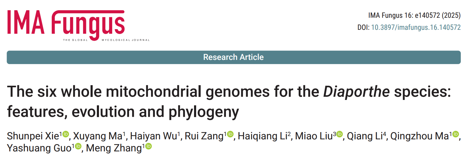 一区国际真菌学协会旗舰期刊《IMA Fungus》杂志(IF 5.2)在线发表了题为“The six whole mitochondrial genomes for the Diaporthe species: features, evolution and phylogeny”的研究论文。