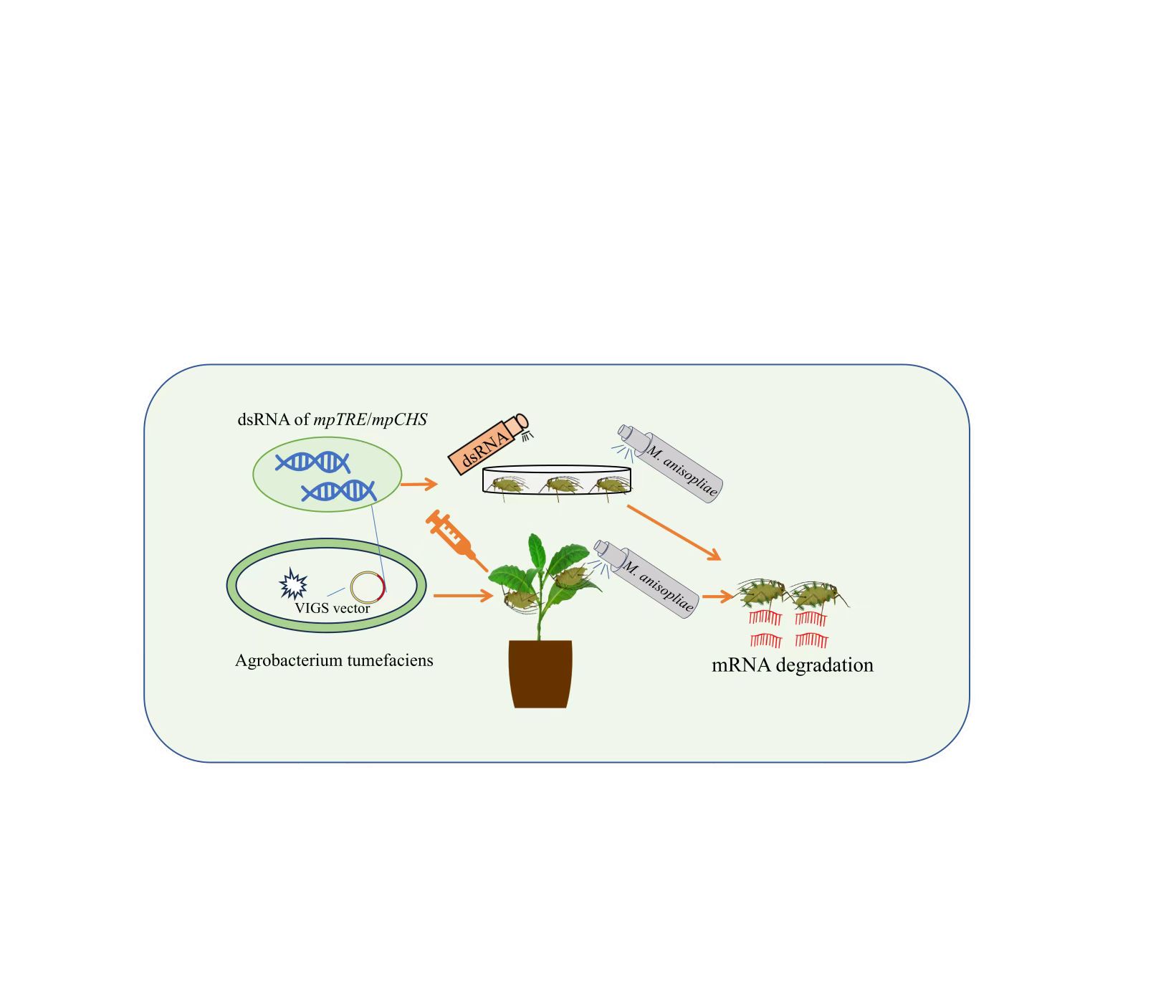 烟蚜,又称桃蚜或者绿桃蚜(Myzus persicae)是世界范围内的重要害虫之一,体色多样,可以传播多种植物病毒,繁殖能力强种群数量多,存在世代交替的现象,多数情况下以孤雌繁殖为主,逆境条件下可产卵孵化。烟蚜寄主广泛,在果树,蔬菜和许多其他经济作物上都有危害。对于刺吸式口器的昆虫防治主要是使用化学农药,化学农药的过量使用造成农药残留以及环境污染。基于RNAi原理的核酸农药被称为第三代新兴农药,有助于减少化学农药的使用。利用植物表达dsRNA靶向害虫的重要基因,沉默害虫体内的靶基因。病毒诱导的基因沉默(Virus induced gene silencing, VIGS)可以在植物体内表达感兴趣的dsRNA,通过该方法可以实现对昆虫基因的沉默,提高对昆虫的防治效果。
