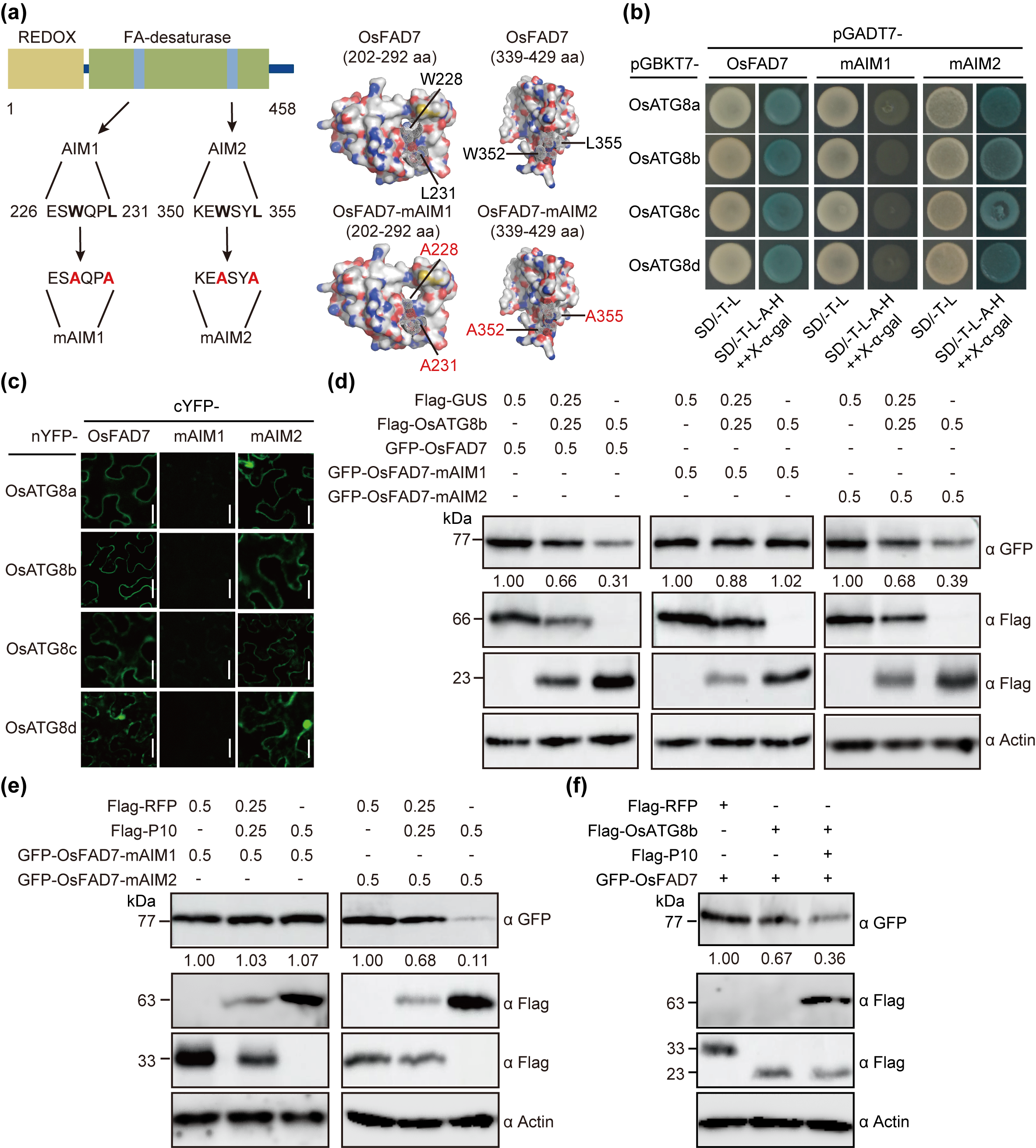 细胞自噬作为一种高度保守的蛋白质降解机制,在植物-病毒互作过程中发挥关键作用。已有研究表明,自噬在植物抗病毒防御中具有双重功能:一方面,寄主可通过自噬途径选择性降解病毒蛋白或病毒颗粒,从而抑制病毒侵染;另一方面,某些病毒已进化出劫持寄主自噬系统的策略,通过干扰寄主防御反应或促进病毒颗粒组装来增强其致病性。植物细胞中,自噬降解途径通常依赖于自噬相关蛋白8(autophagy-related proteins 8, ATG8)与底物蛋白中的ATG8相互作用基序(ATG8-interaction motif, AIM)(保守序列W/F/Y-X-X-L/I/V, X表示任意氨基酸)的特异性识别。本研究通过生物信息学分析,发现在OsFAD7中存在两个潜在的AIM基序。蛋白构象模拟显示,AIM1位点的突变对OsFAD7的空间构象产生显著的影响(图1a)。进一步的分子互作实验证实,当AIM1突变后,OsFAD7与多个OsATG8的相互作用明显受到影响(图1b-c),且GFP-OsFAD7-mAIM1突变体能够抵抗OsATG8介导的蛋白降解,而AIM2突变则不影响这一过程(图1d)。这表明AIM1基序是OsATG8识别和降解OsFAD7的关键位点。此外,AIM1基序同样对P10促进OsFAD7的降解至关重要(图1e),而且P10能够显著增强OsATG8介导的OsFAD7的降解(图1f)。这一系列发现充分证明,RBSDV外壳蛋白P10通过AIM1-OsATG8这一特异性识别系统来促进OsFAD7的降解,揭示了病毒蛋白劫持寄主自噬途径促进自身侵染的分子机制。
