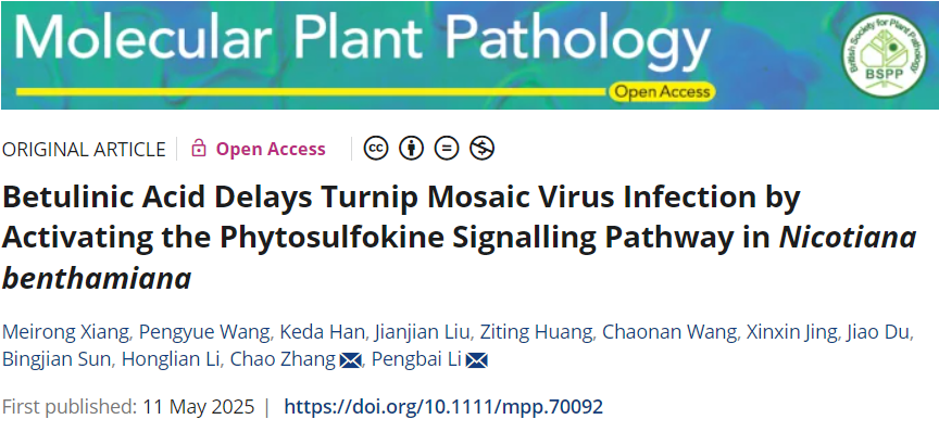 本网讯(通讯员 李彭拜 图片 李彭拜)近日,成人动漫李洪连教授团队/张超教授课题组在植物病理学权威期刊《Molecular Plant Pathology》在线发表了题为“Betulinic acid delays turnip mosaic virus infection by activating the phytosulfokine signalling pathway in Nicotiana benthamiana”的研究论文。该研究系统揭示了植物源物质-白桦脂酸通过激活本氏烟PSK-PSKR信号通路,抵御芜菁花叶病毒侵染的分子机制。