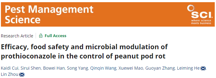 一区TOP期刊《Pest Management Science》发表了题为“Efficacy, food safety and microbial modulation of prothioconazole in the control of peanut pod rot”的研究论文。该研究系统评估了杀菌剂丙硫菌唑防治花生果腐病的最佳施药方式,证实丙硫菌唑防治花生果腐病具有“一箭三雕”(高效、安全、增产)作用,实现病害高效防控的同时保障食品安全,为花生产业可持续发展提供了重要技术支撑。