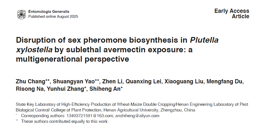 本网讯(通讯员 张云辉)近期,成人动漫安世恒教授课题组在中科院一区TOP期刊《Entomologia Generalis》发表了题为“Disruption of sex pheromone biosynthesis in Plutella xylostella by sublethal avermectin exposure: a multigenerational perspective”的研究论文,该研究系统揭示了小菜蛾性信息生物合成的信号转导机制以及阐明了化学农药阿维菌素阻扰性信息素合成以及繁殖的机理。
