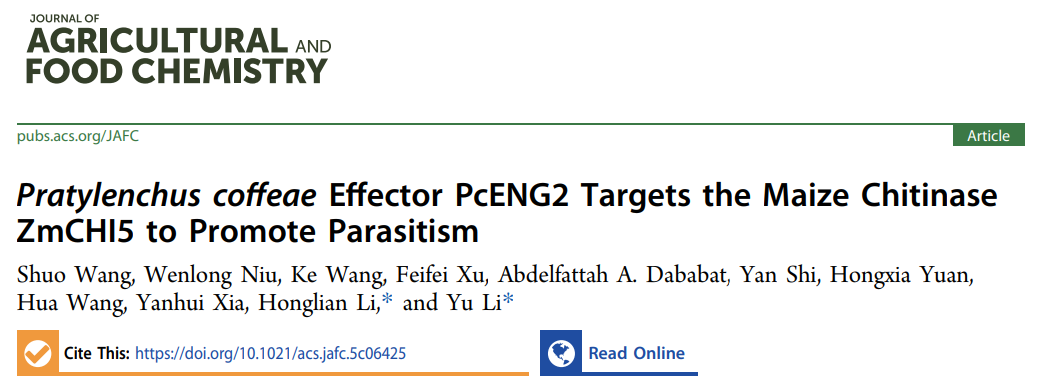 一区TOP期刊《Journal of Agricultural and Food Chemistry》发表了题为“Pratylenchus coffeae Effector PcENG2 Targets the Maize Chitinase ZmCHI5 to Promote Parasitism”的研究论文。该研究解析了咖啡短体线虫效应蛋白PcENG2通过靶向抑制玉米几丁质酶ZmCHI5活性,进而逃逸玉米免疫反应促进线虫寄生的分子机制。