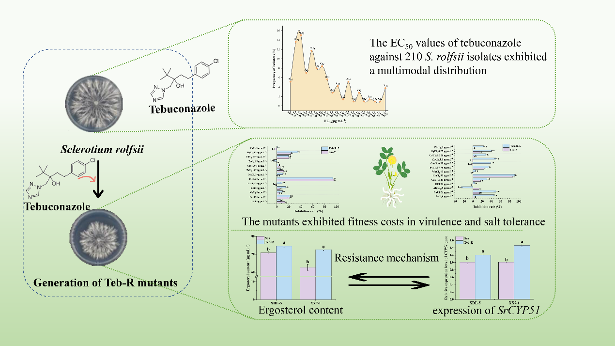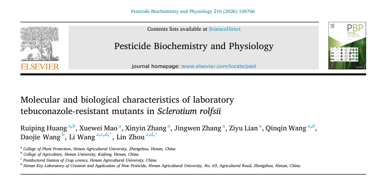 一区TOP期刊《Pesticide Biochemistry and Physiology》发表了题为“Molecular and biological characteristics of laboratory tebuconazole-resistant mutants in Sclerotium rolfsii”的研究论文。该研究揭示了花生白绢病菌齐整小核菌(Sclerotium rolfsii)对三唑类杀菌剂戊唑醇的抗性风险,明确了其抗性主要与靶标基因SrCYP51基因的过表达及麦角甾醇含量的提高紧密相关。该发现为田间花生白绢病菌的科学防控及抗性治理提供理论依据。