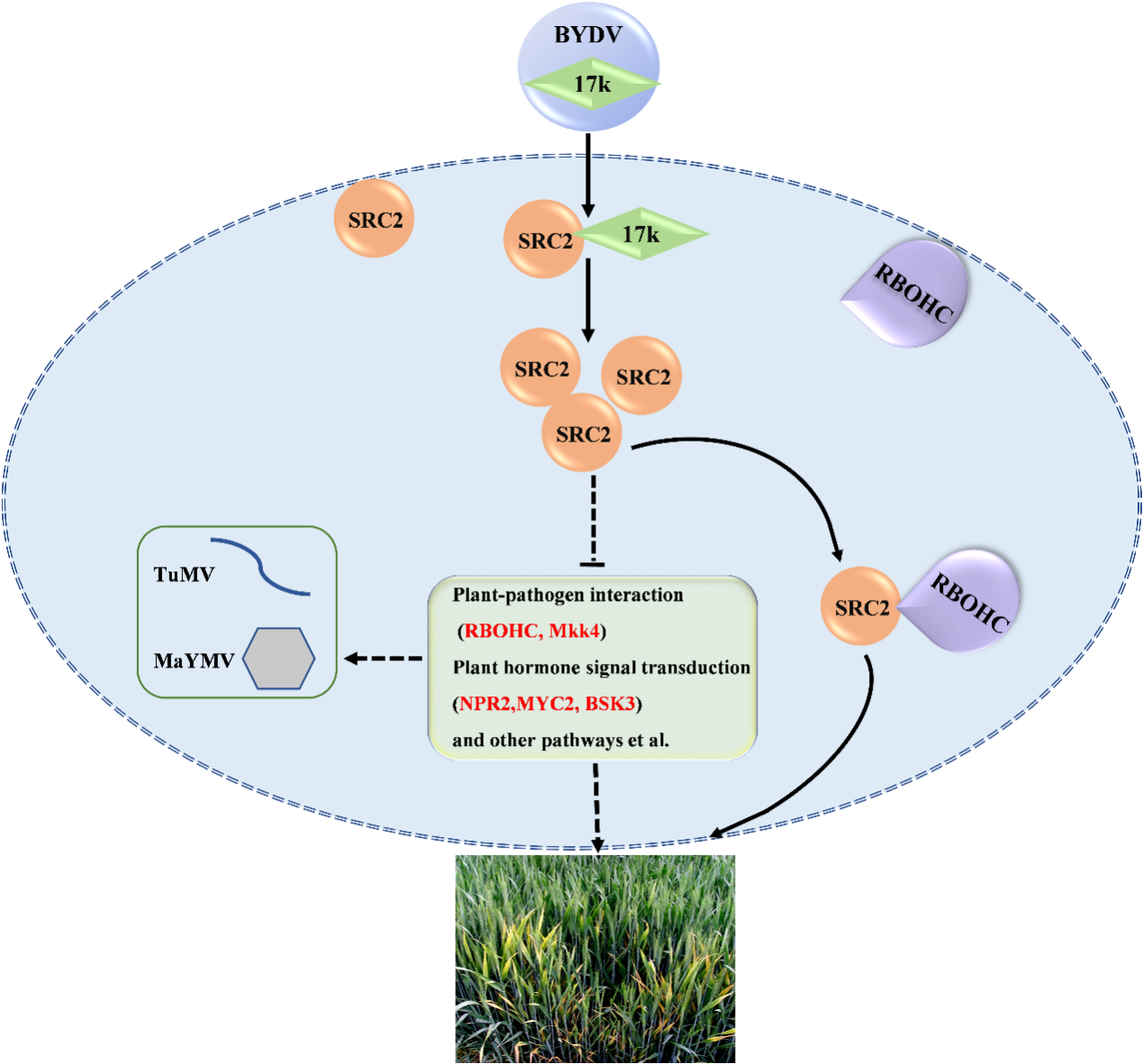 该研究报道了大麦黄矮病毒-GAV(barley yellow dwarf virus-GAV)编码的17K蛋白与大麦中冷胁迫调控蛋白HvSRC2(soybean gene regulated by cold-2)相互作用并促进其积累。SRC2蛋白含Ca2+结合结构域,能够响应生物及非生物胁迫,然而SRC2在调控病毒感染中的作用目前尚不清楚。在HvSRC2基因沉默大麦植株中,BYDV-GAV的病毒积累量显著降低。转录组测序表明,HvSRC2调控植物防御相关通路,如植物激素信号转导、植物-病原物互作以及其他抗病通路。HvSRC2沉默的大麦植株中HvRBOHC、HvRGA1、HvB-2b、HvNPR2、HvBSK3、HvRPP13L3、HvMYC2和HvMkk4等植物免疫相关基因在表达上调。进一步发现大麦中NADPH氧化酶HvRBOHC(Respiratory Burst Oxidase Homolog C)与HvSRC2相互作用。HvRBOHC的沉默促进了BYDV-GAV的积累,同时伴随其他HvRBOHs表达上调以及H2O2和O2-水平升高。此外,我们还发现玉米黄花叶病毒(maize yellow mosaic virus,MaYMV)编码的MP和芜菁花叶病毒(turnip mosaic virus, TuMV)编码的VPg均能与HvSRC2相互作用,表明病毒蛋白与SRC2之间互作存在相对保守性,NbSRC2沉默可以有效抑制TuMV和MaYMV的病毒积累量。综上所述,该研究发现植物病毒编码蛋白通过利用寄主内SRC2调控植物防御过程促进自身侵染的广谱调控机制。