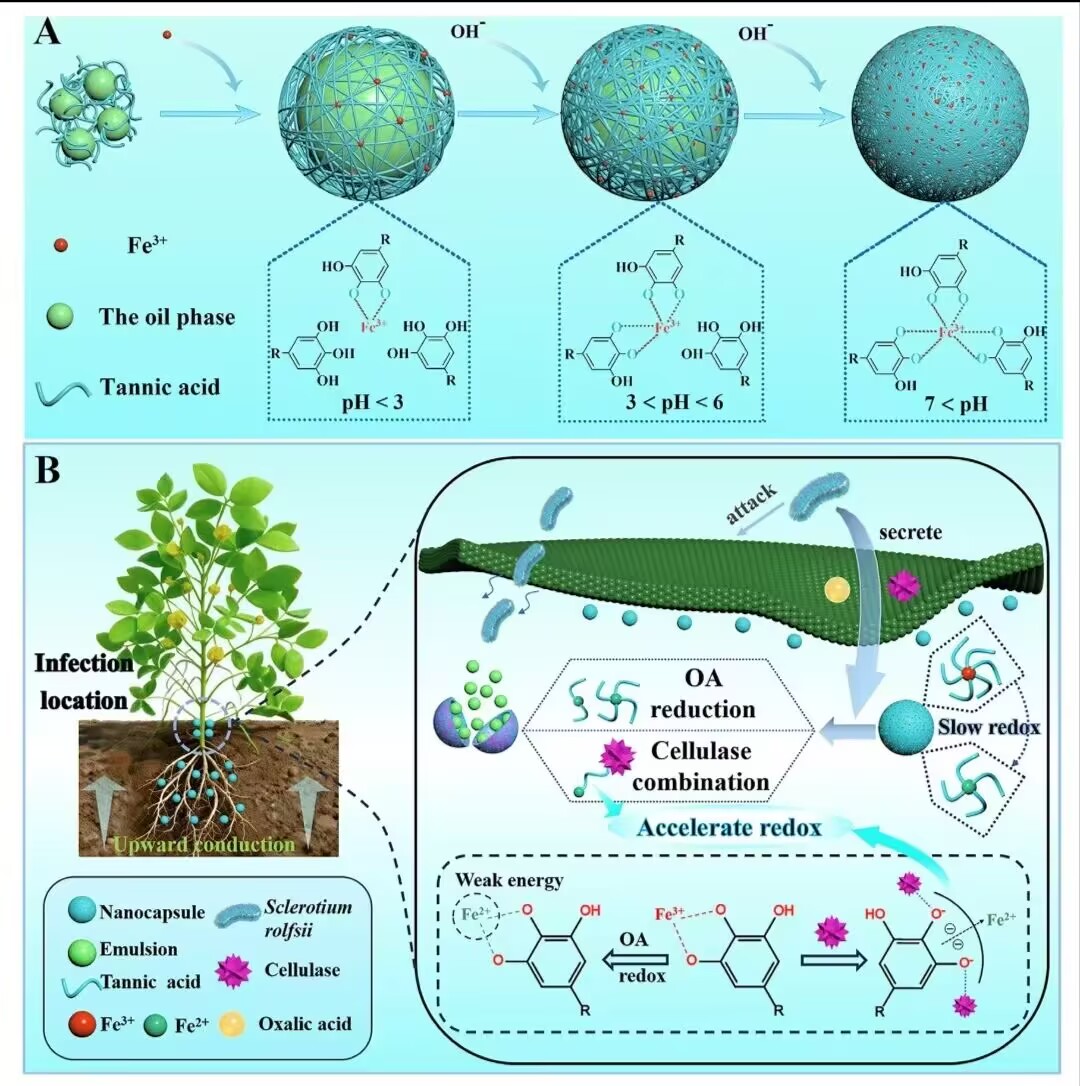 图.(A)TA@Fe NCs的自组装。(B)针对Sclerotium rolfsii的双重触发(纤维素酶和草酸)解体机制