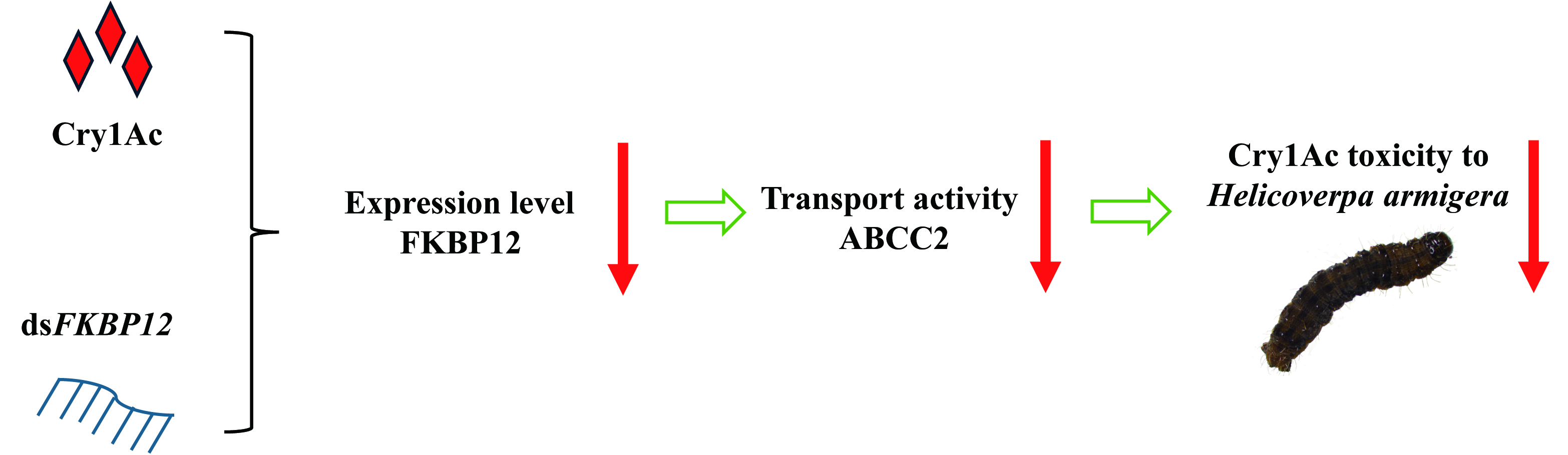 Bacillus thuringiensis(Bt)蛋白是农业害虫绿色防控中的重要杀虫蛋白,而 Bt 蛋白作用过程中受体蛋白及其调控机制仍有诸多关键问题亟待阐明。本研究以棉铃虫(Helicoverpa armigera)为研究对象,围绕FKBP12对Cry1Ac毒性的影响及其与ABCC2的相互作用展开系统研究。研究发现,Cry1Ac处理及 Bt 抗性棉铃虫中 FKBP12 与 ABCC2 的表达水平均显著下调;在细胞水平上,沉默 FKBP12 显著降低中肠细胞对 Cry1Ac 的敏感性,而过表达 FKBP12 则显著增强 Cry1Ac 的细胞毒性。进一步通过酵母双杂交(MbY2H)和免疫共沉淀(Co-IP)实验,研究证实 FKBP12 可与 Cry1Ac 关键受体 ABCC2 直接结合,并影响Cry1Ac毒力。功能分析表明,FKBP12调节ABCC2 的转运活性,在 ABCC2 被干扰的情况下,FKBP12 对 Cry1Ac 毒性的增强作用明显减弱。上述结果首次从分子伴侣调控受体作用角度阐明了 FKBP12与ABCC2在Bt蛋白作用机制中的关键作用。该研究不仅拓展了 FKBP12 在昆虫生长发育与毒素响应中功能的认识,也为理解 ABC 转运蛋白介导的 Bt 抗性机制提供了新视角,对挖掘新型害虫防控靶标和延缓 Bt 抗性演化具有重要科学意义。