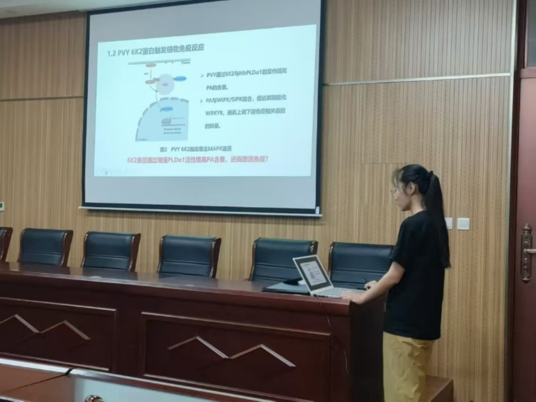 林佳宇博士以“马铃薯Y病毒调控寄主磷脂酶D活性的机制研究”为题,向大家首先阐述了马铃薯Y病毒通过调控磷脂酶D(PLD)和磷脂酸(PA)触发植物的免疫反应。林佳宇博士通过双分子荧光互补实验和免疫共沉淀实验证明马铃薯Y病毒的复制蛋白6k2蛋白与PLD互作并促进PLD的磷酸化,增强PLD的活性,提高PA的含量,进而触发寄主MAPK途径,为马铃薯Y病毒的发生与防治提供了新的方向。