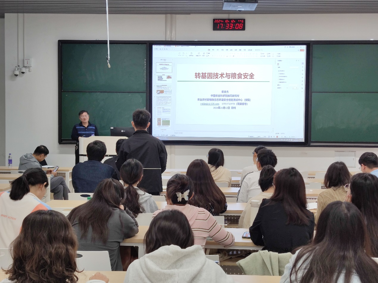 授课内容涉及全球转基因生物研发进展、我国生物育种产业化成就以及转基因技术在粮食安全中的关键作用。崔金杰研究员对转基因技术在提高作物产量、抵御病虫害以及推动农业绿色可持续发展方面的卓越贡献进行了详细阐述,并着重提出发展现代生物育种技术对于确保我国粮食安全的重要性。结合我国农业目前所面临的挑战,崔金杰研究员特别强调了转基因技术在应对全球气候变化、耕地缩减、病虫害侵袭以及种质资源保护等方面所具有的独特优势。他提到,借助于转基因技术,我国在抗虫棉、抗虫玉米等领域已取得显著突破,未来我国将持续推动生物育种产业化进程,加快科技创新步伐,确保国家的粮食安全稳固可控。