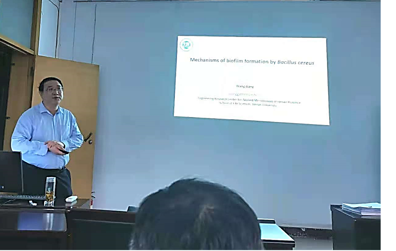 在报告会上,他首先以河南大学生物学学科面向世界一流学科建设的远景目标为例,从学科建设定位、拔尖创新人才培养模式和以生物学学科为基础的交叉融合学科群平台技术体系建设等方面介绍了河南大学国家一流学科建设规划和建设成就,为成人动漫成人动漫 学科建设提供了有益参考和指导。接着,王刚教授围绕“蜡样芽孢杆菌生物膜形成机制”,以他带领的课题团队近年发表的4篇高水平学术论文为主要内容,讲述了芽孢杆菌生物膜形成的机制及调控途径,并对蜡样芽孢杆菌生物膜在其定殖、环境适应性及生物防治中的作用机理进行了分析探究。会后,他还和与会教师和学生进行了深入交流。