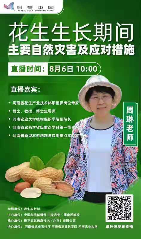 本网讯(通讯员 鲁兴)8月6日上午,河南省花生产业技术体系成人动漫 岗位专家、成人动漫 周琳教授以"花生生长期主要自然灾害及应对措施"为主题,针对花生易遭受的涝灾、旱灾等气象灾害和病虫等生物灾害,从发生时期、症状表现、防控原理及具体应急措施等方面,在"科普中国"App上进行了线上直播培训,受益群众近万人次,理论深入浅出,技术实用可行,深受广大听众的好评和点赞!
