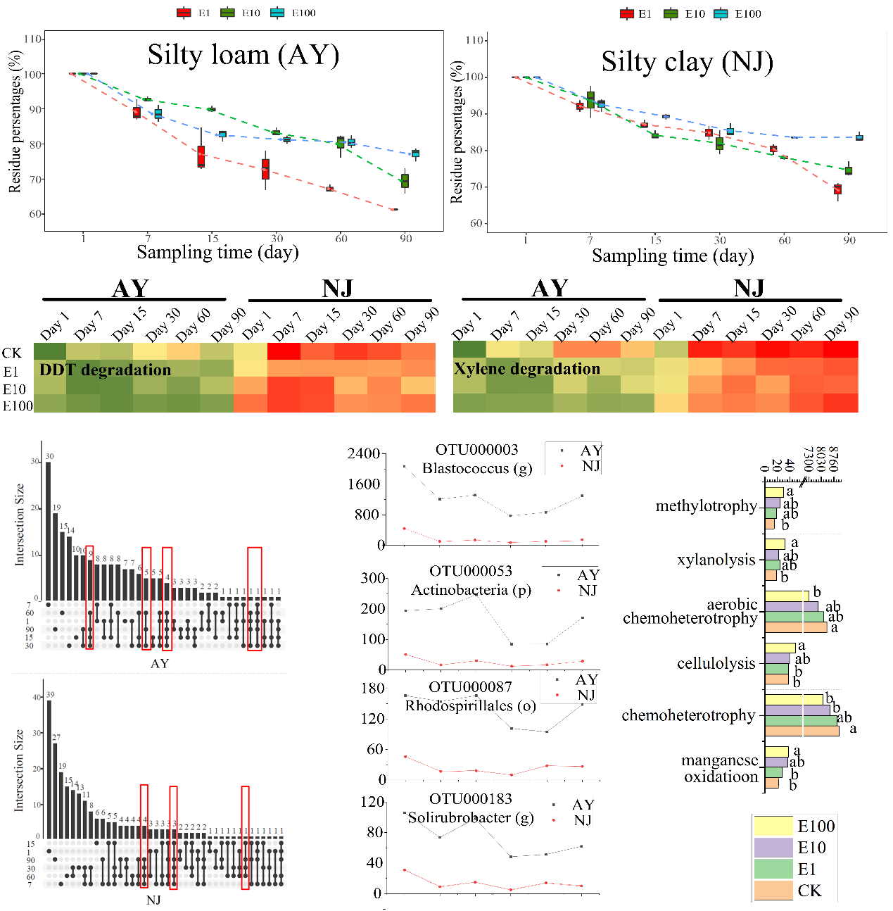 据杜鹏强博士介绍,氟环唑作为一种广谱的三唑类杀菌剂,进入土壤长期积累将严重威胁生态平衡和人类健康。本研究通过对典型土壤进行室内培养和分析,利用二代测序技术监测土壤微生物的变化,研究了氟环唑对土壤功能的潜在威胁。分析发现Blastococcus、Luedemannella、Solirubrobacter、Geodermatophilus、Rhodospirillales、Pseudonocardia、Luedemannella、Nocardioides、Gemmatimonas等39种细菌在氟环唑降解过程中发挥关键作用,且Blastococcus、Luedemannella、Solirubrobacter、Geodermatophilus、Rhodospirillales丰度在粉砂壤土中比粉砂粘土高出2倍多,证实了微生物因素是影响氟环唑在不同土壤中降解效率的关键因子。通过比对21条参与有机污染物降解通路发现,有多达19条通路的活性在氟环唑的作用下显著升高。同时,两种土壤中C、N、S、Mn代谢受到干扰,影响作物的营养吸收,对作物生长和抗病造成一定威胁。