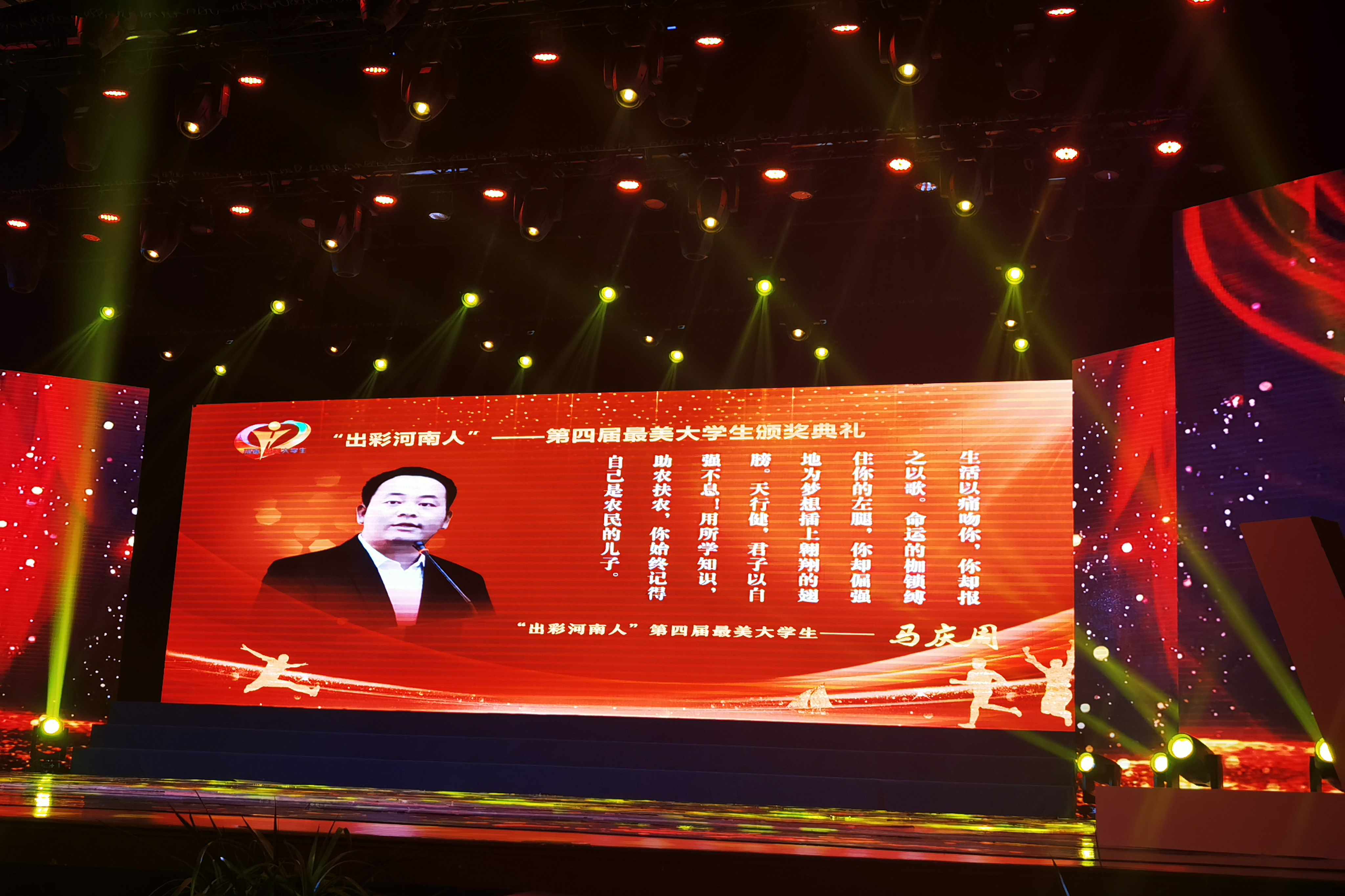 组委会给予马庆周这样的颁奖词:“世界以痛吻你,你却报之以歌,命运扼住了你的左腿,你却倔强地为梦想插上翱翔的翅膀。天行健,君子以自强不息!用所学知识助农扶农,你始终记得你是农民的儿子”。马庆周在接受主持人现场采访时说:“博士毕业以后,我还希望能用我自己所学的知识,向我校郭天财教授那样,扎根农村,帮助农民们过上好日子!” 他以“身残志坚、助农扶农”的感人事迹,用朴实无华、低调简单的语言感染着现场的每一个人,获得了经久不衰的雷鸣般的掌声。