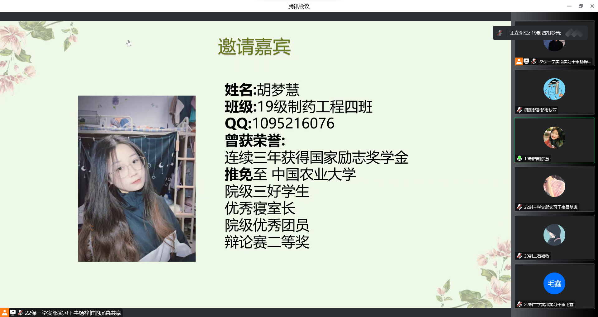 学生代表结合自身实际分享学习、生活经验、困难应对策略,探讨角色转变、学生组织对个人能力的提升,强调大家一定要有树立坚定的目标及矢志不渝的信念,鼓励大家在保障学习的前提之下,多参加社团活动全面提升个人综合素质。