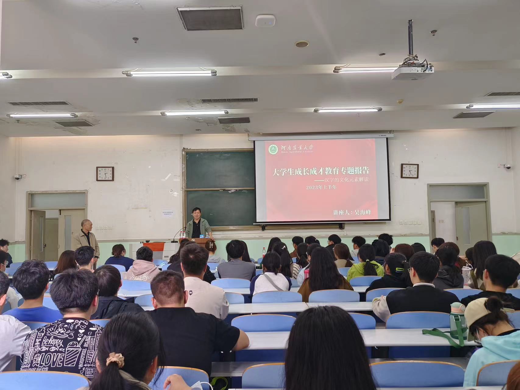 吴海峰从河南对汉字的贡献、错字里的文化和偏旁部首里的文化三个方面讲述了汉字的发展历史及其对文化传承的重要作用,以生动有趣的方式向同学们展示了汉字的逐步发展,介绍了四种造字方法会意、象形、指事和形声。互动环节,同学们积极提问,吴海峰老师热情解答,帮助大学生深入了解汉字的文化魅力,助力成长成才。