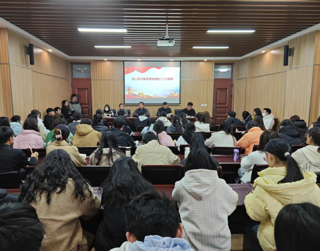 报告厅举办深入学习党的二十大精神报告会。院党委书记李兴道、院党委副书记鲁兴分别作了讲话,院团委书记黄姗姗主持会议,院团委副书记白瑜瑾、团委老师王赟飞以及全体学生干部参加会议。