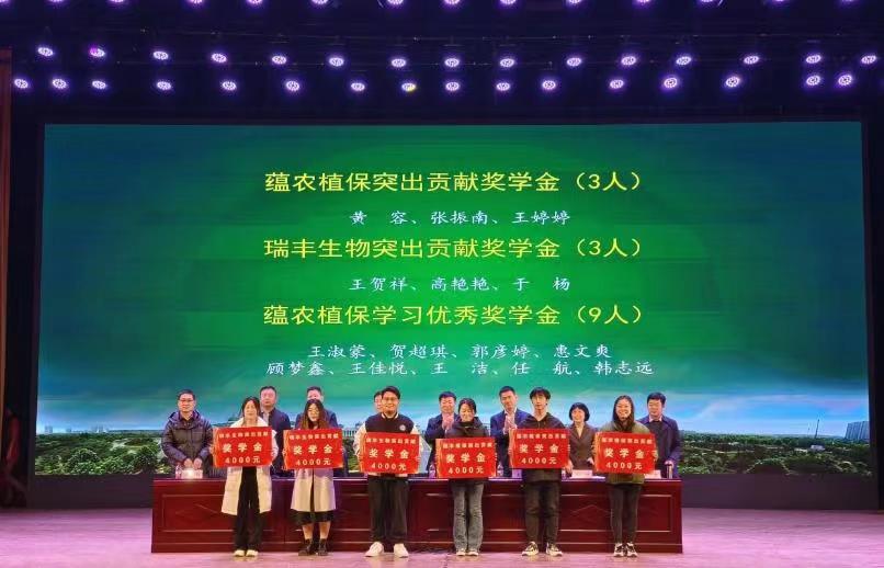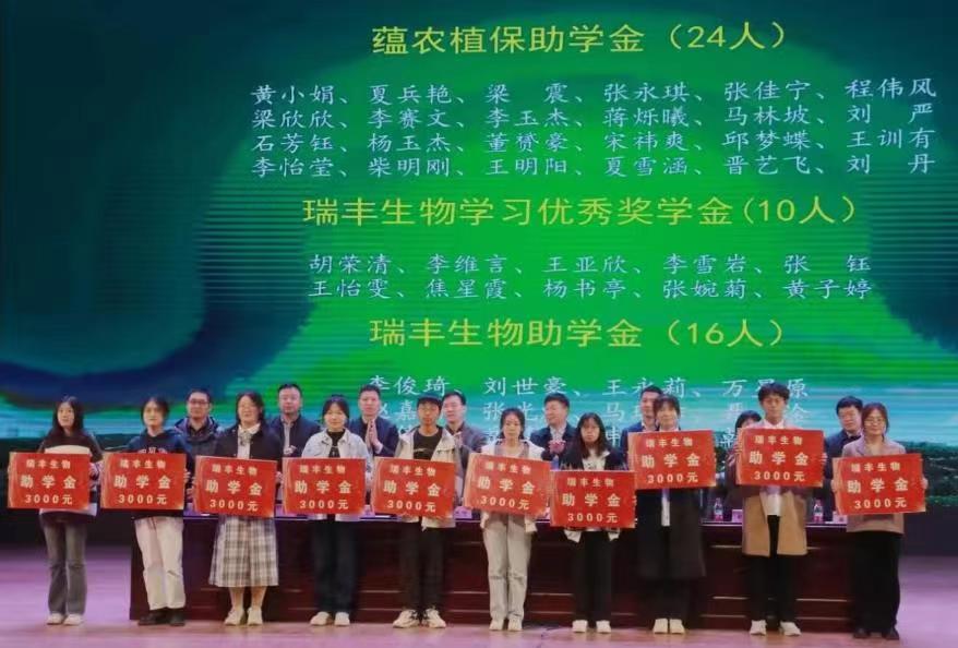 颁奖仪式在嘹亮的国歌声中拉开序幕。副院长周琳宣读了2022年度蕴农植保奖助学金、瑞丰生物奖助学金评选结果,获奖的45名学生依次上台领奖。