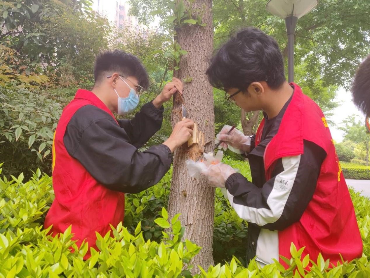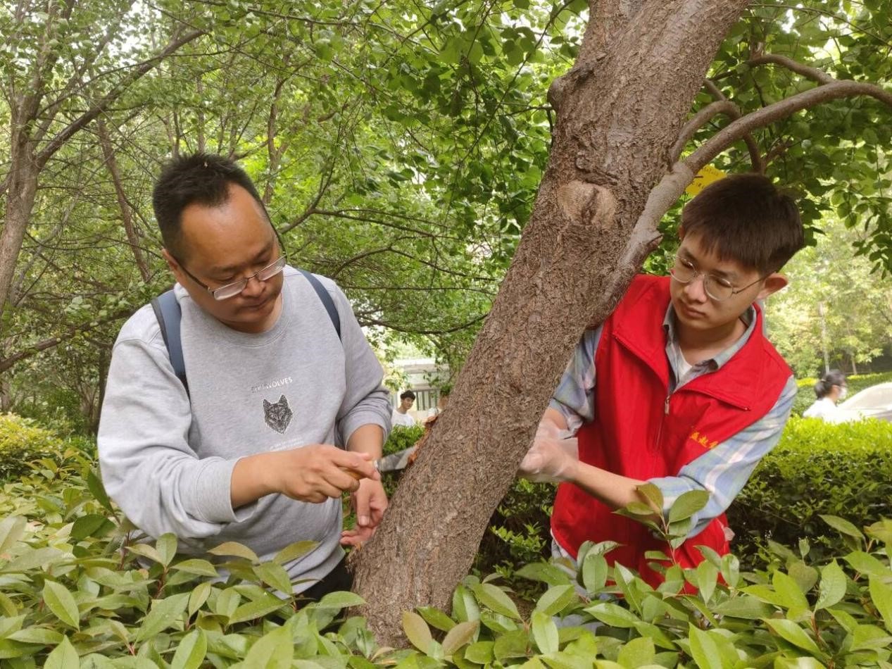 伴着明媚的阳光,迎着和煦的春风,同学们以小组为单位,开始了一天的实习。高飞、谢桂英两位老师亲自为同学们演示了防治天牛实验和防治流胶实验的操作过程,指导学生动手操作。学生们认真聆听,深入探索,并与老师积极互动、气氛融洽,收获颇多。同时,同学们从校园植物入手,就校内植物常见的病虫害防治农药使用情况开展调查,加强了对不同农药种类及使用方法的了解,进一步巩固和强化对所学知识的理解和认知。