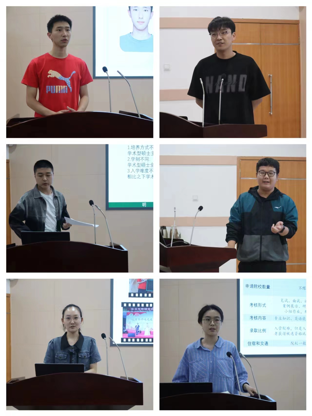 六位优秀毕业生代表结合自己的大学经历从不同角度进行了事迹分享。郑旗星从学习和生活方面讲述了自己的经历,传授相关经验,强调要把握时间,拒绝拖延,分享内容非常有借鉴意义。刘卓达从学习效率、心态等方面讲述自身考研历程,激励同学们要尽早树立远大目标,持之以恒努力奋斗。李慧营围绕考研流程和参军入伍两个方面详细讲述,切实解答同学们的疑惑。吕天天从参加活动比赛、学习和考研三个方面分享自己的大学生活,鼓励同学们勇于尝试,探索行之有效的学习方法,提高课堂效率。李冠儒向同学们介绍了毕业后的相关事项及毕业去向,着重详细讲解了选调生报考条件流程。吴雅童从保研经验向同学们介绍保研条件及流程,希望同学们能够在日常学习中努力提升自我,抓住机会。在互动环节,22级同学都积极踊跃向学长学姐提问,现场气氛融洽。