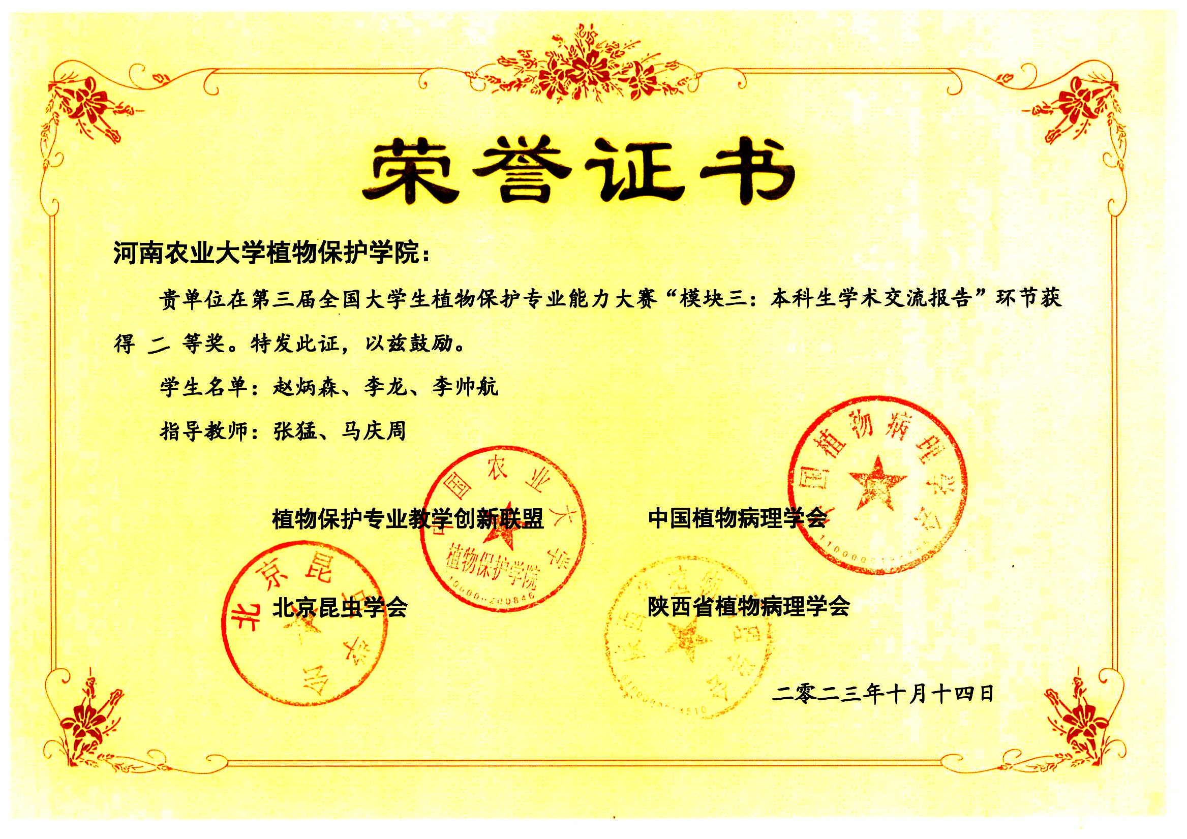 专业的高质量发展,加强专业技能与创新实践能力培养和教学体系建设,全面提高大学生的综合素质和培养质量。成人动漫代表队荣获团体一等奖的佳绩,同时取得“本科生学术交流报告”模块二等奖和“植物病理学实验操作和病原物结构绘图”项目三等奖。