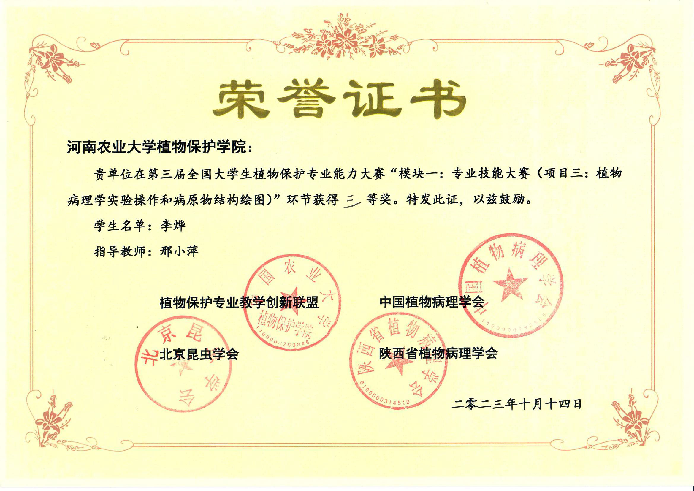专业实践教学改革和实践教学体系建设,加强专业技能和创新实践能力培养,以赛促学、以赛促教,全面提高大学生的综合素质和培养质量,践行学农爱农,服务“三农”初心使命,为植保事业的发展奉献智慧和力量。