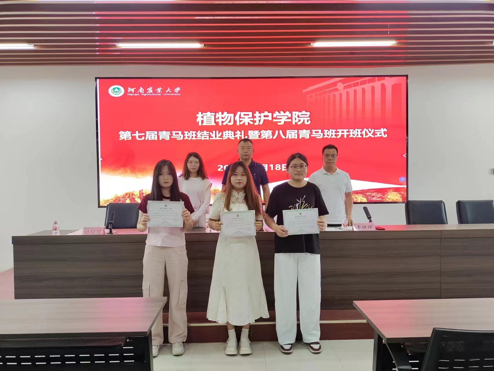 鲁兴、白瑜瑾为第七届青马班学员代表关梦焓、司雯倩、王振颁发结业证书。