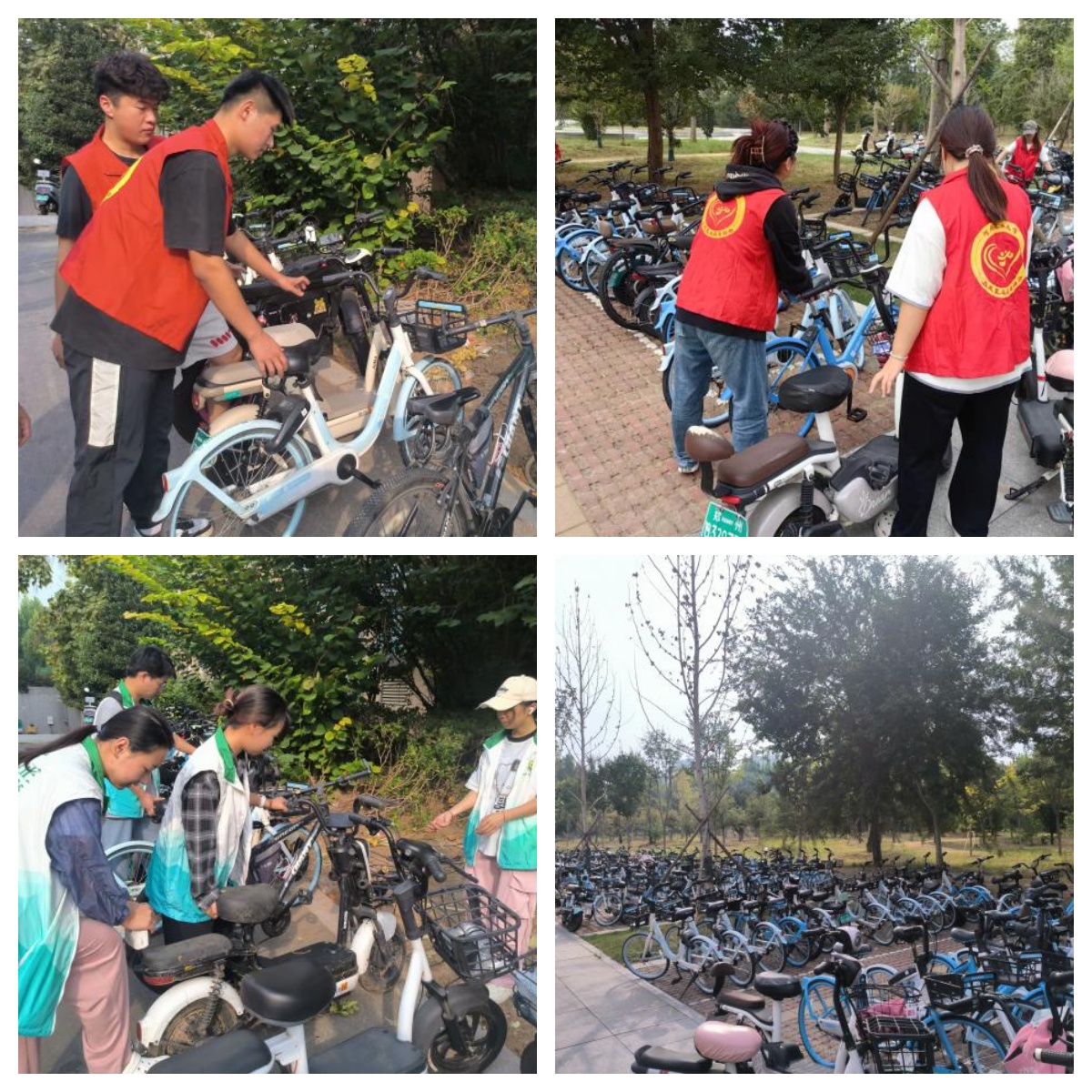 志愿者们分批到达校园内共享单车停放点,有序分工,通过清理单车篓内垃圾、有序摆放单车,解决了校园内共享单车停放杂乱的问题,同时提升了校园环境的整洁度与美观度。通过志愿者们的辛勤付出和积极引导,单车规范停放以一种生动实践的方式,向全校师生传递了绿色环保、文明出行的重要信息,激发了大家对构建美好校园环境的共鸣与行动。