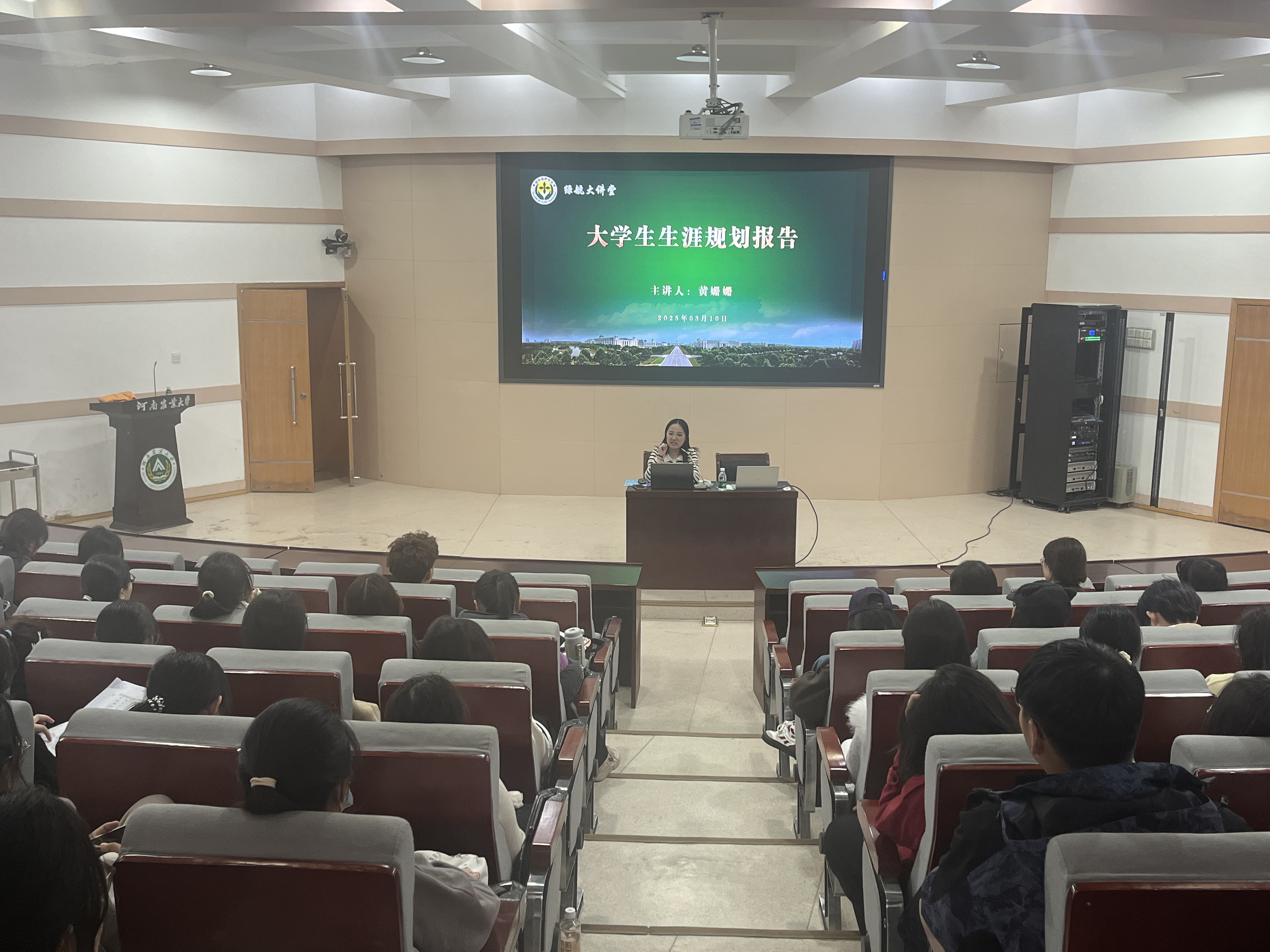 本网讯(通讯员 李晴 图片 青语大学生记者团)3月10日下午,成人动漫特邀院团委书记黄姗姗于文化路校区300人报告厅举办“绿航大讲堂-大学生生涯规划”主题报告,讲座由辅导员郭俊阳老师主持,24级全体学生参加讲座。