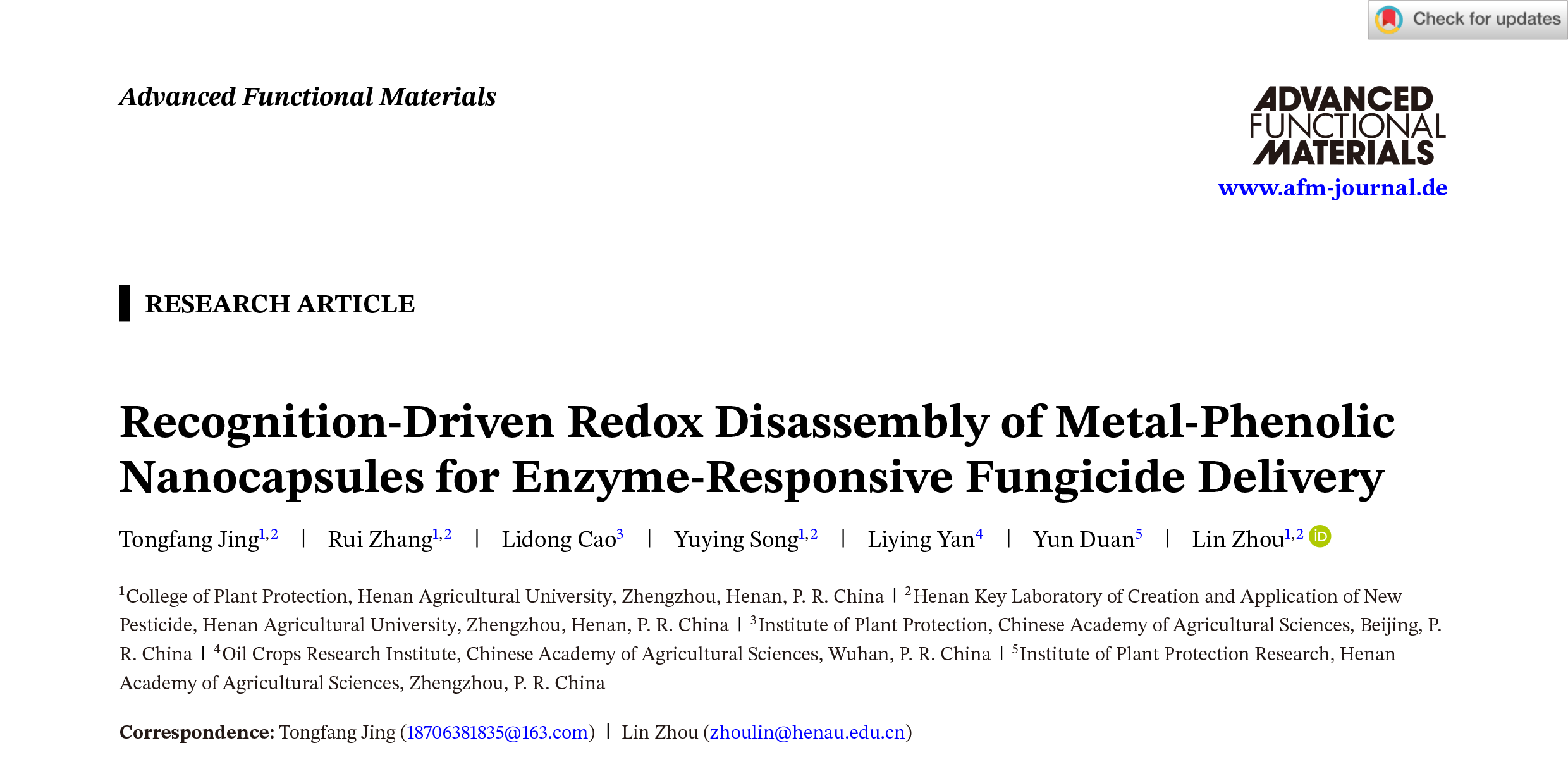 周琳/敬同坊团队在材料科学国际顶级期刊《Advanced Functional Materials》(IF: 19.0, Nature Index期刊)上发表了题为“Recognition-Driven Redox Disassembly of Metal-Phenolic Nanocapsules for Enzyme-Responsive Fungicide Delivery”的研究论文。该研究通过单宁酸(TA)、Fe3+和羧甲基纤维素钠(CMC)的自组装,构建了一种全新的“生物识别驱动”智能纳米农药递送系统,揭示了病原菌纤维素酶特异性结合TA从而加速Fe3+还原、触发纳米胶囊精准解体的全新机制,为攻克复杂土传病害的精准防控难题提供了新策略。