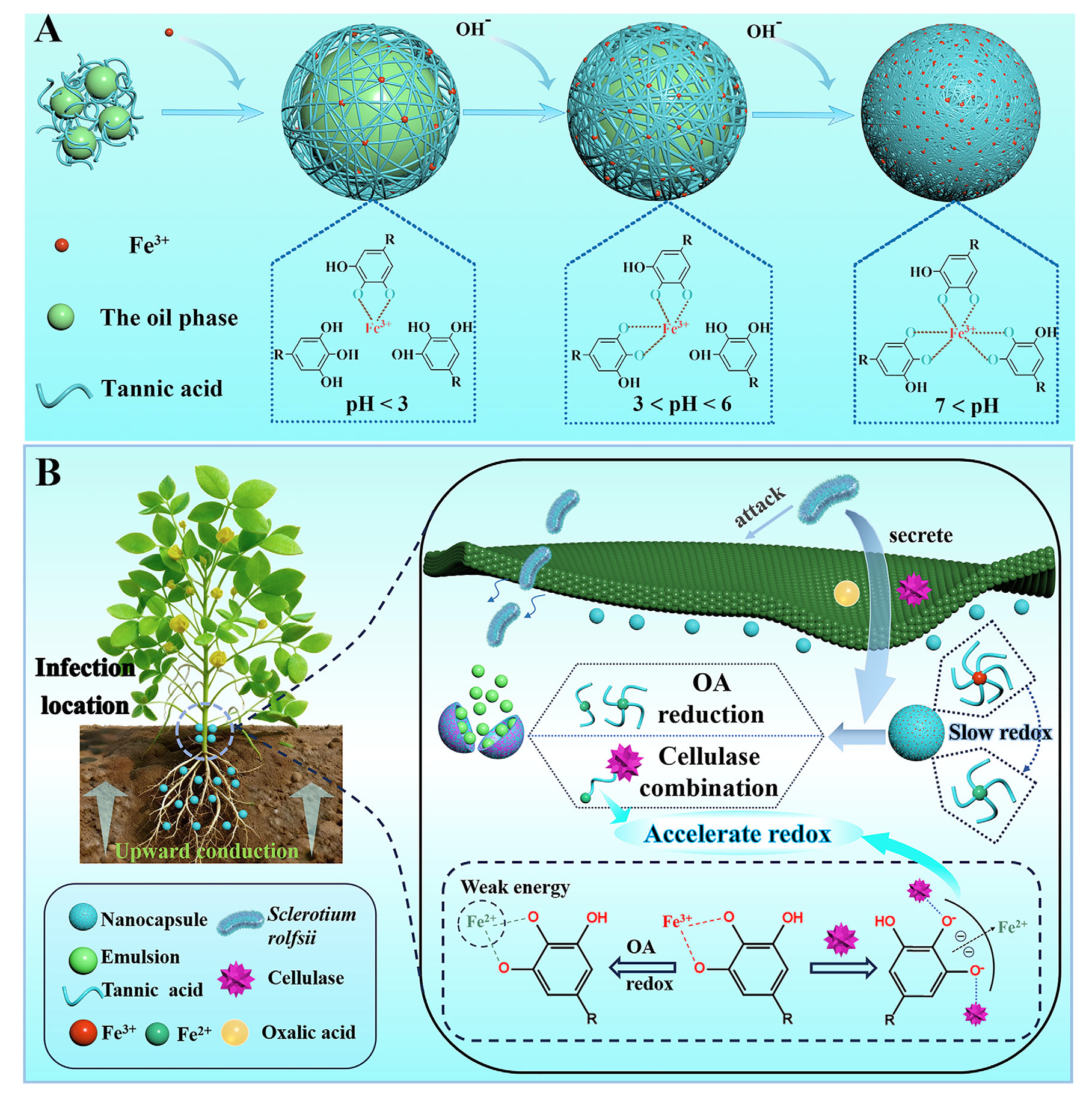 图.(A)TA@Fe NCs的自组装。(B)针对Sclerotium rolfsii的双重触发(纤维素酶和草酸)解体机制
